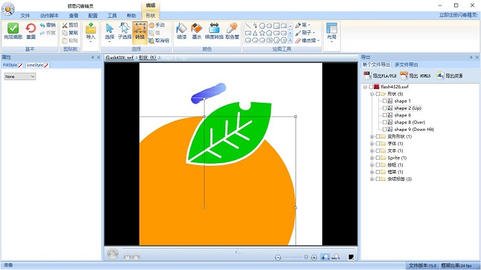 在图形的编辑面板中,我们可以使用其中的“转换”工具对图形进行一定的修改。如下图所示,我们将橘子形状左移了一点,并让叶子外移一点,让橘子的形象更加明显。