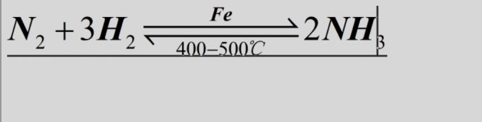 4、点击工具栏中的箭头模板,选择双向箭头,并在上方添加催化剂Fe,在下方插入温度400-500°C,最后输入生成物2NH₃,公式如下图所示。