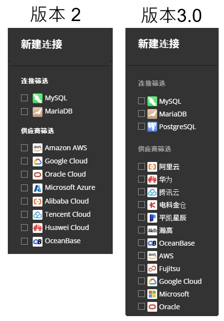 如果我们单击应用程序主屏幕顶部的“+新建”按钮,将出现一个包含两个项目的上下文菜单:“新建项目”和“新建连接”。单击后者将打开“新建连接”对话框。查看连接筛选,我们可以看到有许多新的连接类型,其中最引人注目的是 PostgreSQL。除此之外,供应商筛选还扩展到包括Fujitsu、HighGo、金仓等: