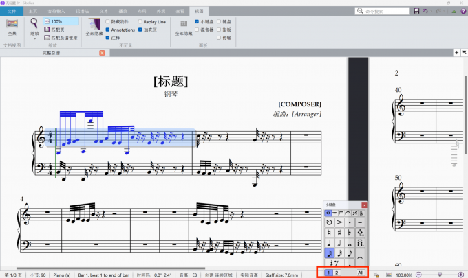 3、进入到乐谱编辑的主页面之后,我们就可以利用西贝柳斯小键盘中的音符进行打谱操作。在小键盘中可以看到【1】【2】两个数字,这两个数字分别代表了西贝柳斯的两个声部。我们可以手动选择需要打谱的声部进行添交叉打谱操作。