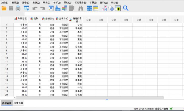 这是一份对不同人群早餐选择的调查数据,通过SPSS的多元回归分析,可以将人群特征变量对早餐类型进行分析,找到它们之间的关系。