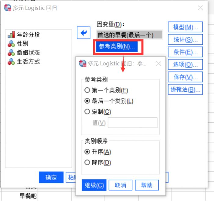 点击“参考类别”,设置因变量的参考类别,这是分析时的参考样,我们设置为所有类别都和最后一个类别对比,类别顺序选择升序。