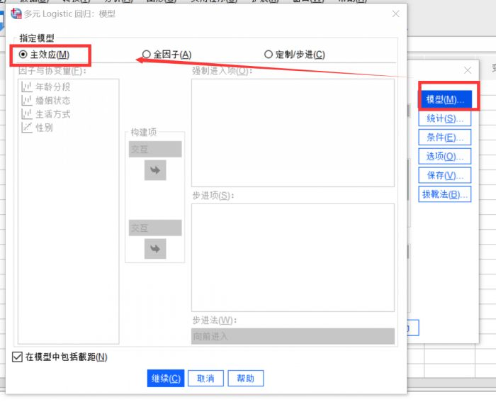 SPSS的多元回归分析有三类模型可选,主效应是指设置好的因子和协变量与因变量之间的关系分析;全因子模型既包括主效应,也包括因子和协变量之间的交互分析;定制步进式则可以有用户自己定义分析类型。