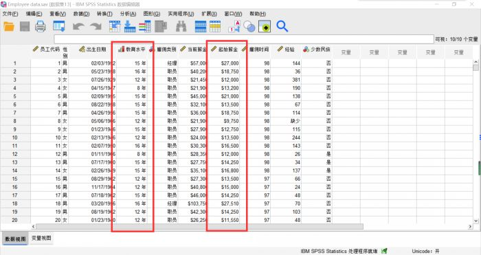 数据样本如上图所示,是某家公司录取员工的基本情况,我们要探究的是教育水平和起始薪金之间的相关性。