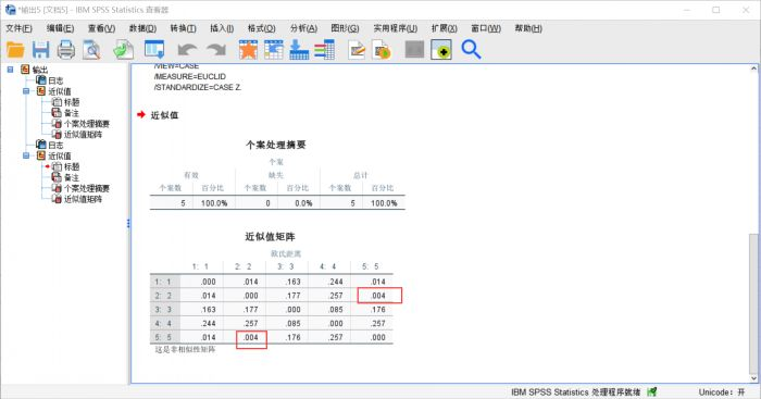 这种分析方法的结果是得到一个非相似性矩阵,表中的参数值越小,相似性越大,表中显示,个案2和个案5之间的距离最小,所以他们的相关性最强。