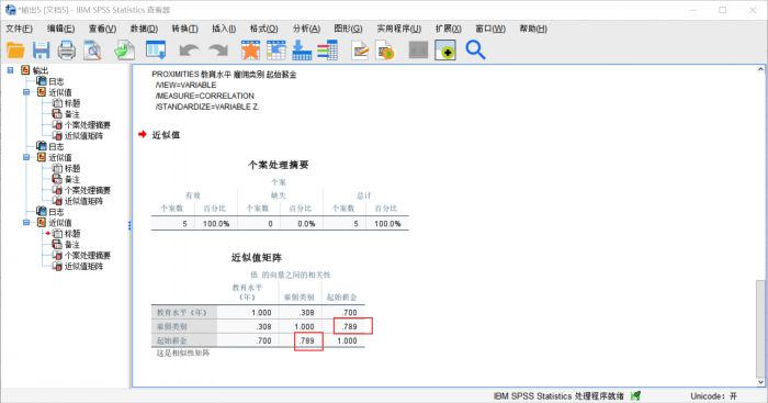 选择本数据样本的前五组数据作为分析对象,通过对教育水平、雇佣类别、起始薪金、现在薪金、经验几个变量的分析计算个案间的非相似性距离。