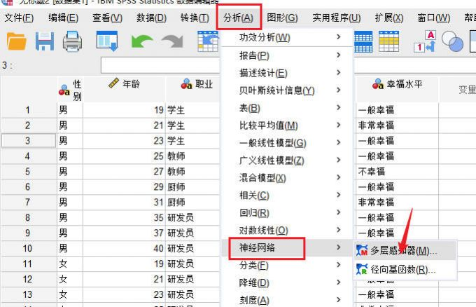 2、分析-神经网络。随后切换到【分析】选项卡,依次点击其下拉列表中的【神经网络-多层感知器】选项。