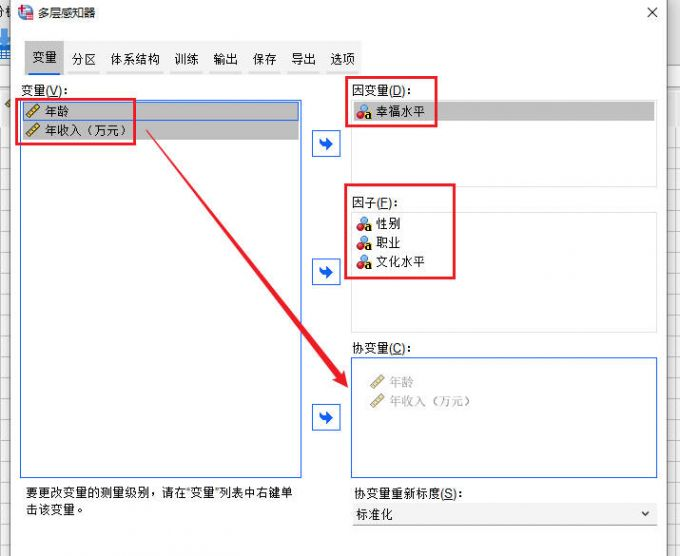 3、设置多层感知器。进入多层感知器的设置窗口后,我们按照数据类型,分别将【因变量、因子和协变量】拖拽到对应的目标选框。