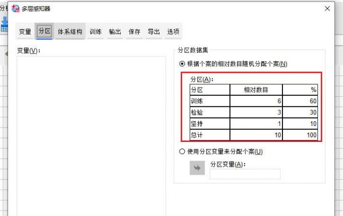 4、设置分区。随后切换到【分区】选项卡,根据分区表格中对于神经网络的分区占比进行设置,主要包括【训练、检验和坚持】三项。
