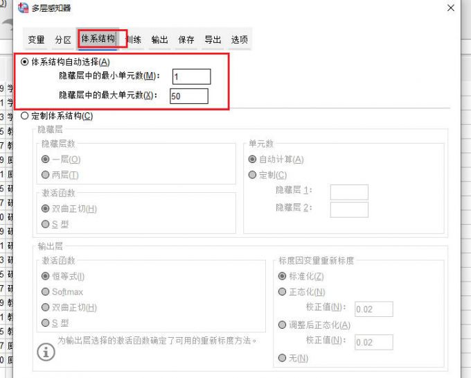 1、体系结构。在神经网络的创建过程中,我们可以切换到【体系结构】选项,点击其中的【体系结构自动选择】选项,将隐藏层的【最小单元数】设置为1,【最大单元数】设置为50。