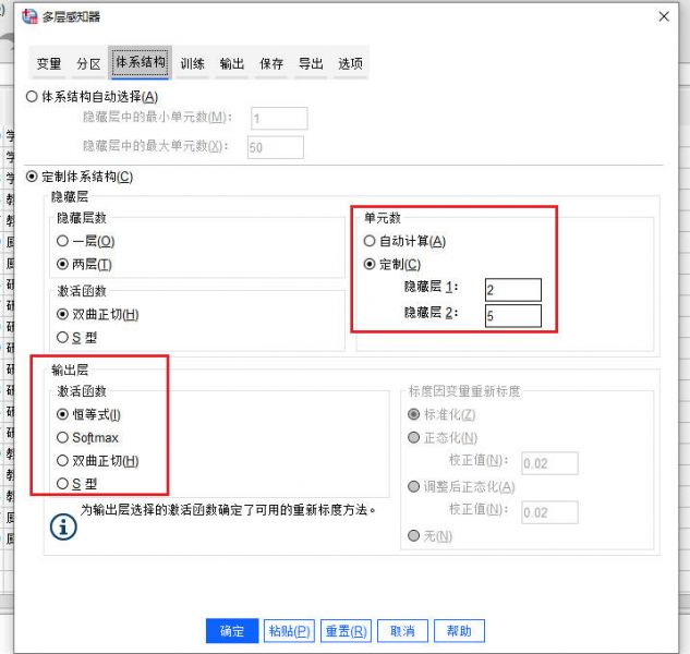 3、其他设置。另外我们还可以对隐藏层的【单元数】进行设置,包括自动计算和定制两种;下方的【输出层】也可用于激活特殊的函数公式。