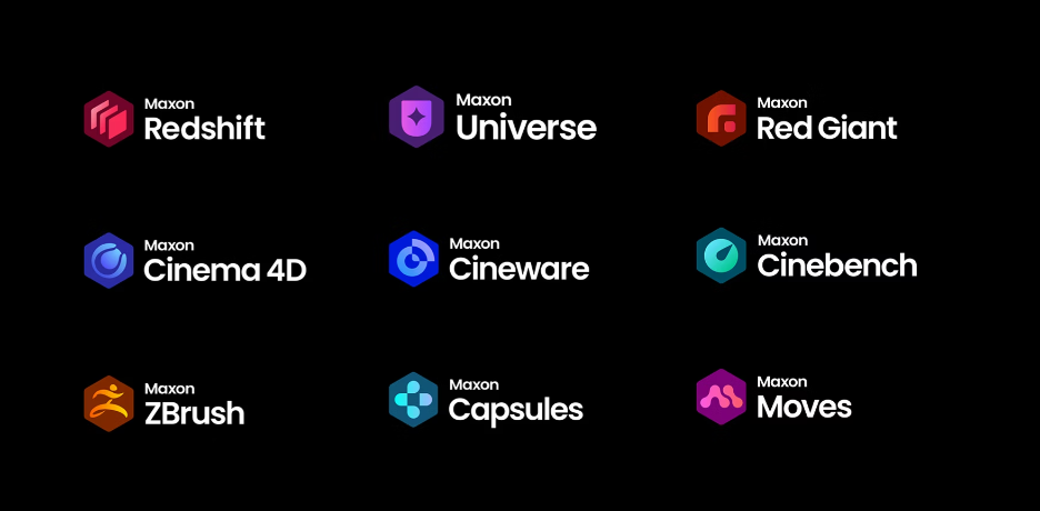 Maxon全新产品标识经过精心设计,可与现有品牌标志无缝融合。标识采用蜂窝状视觉风格,呼应Maxon One的核心理念:各工具用途独立鲜明,却在工作流中高度统一,协同运作时更显强大效能。每款标识均采用极简几何设计与鲜明强调色,既能确保用户瞬间识别,又能完美融入整体品牌架构之中。