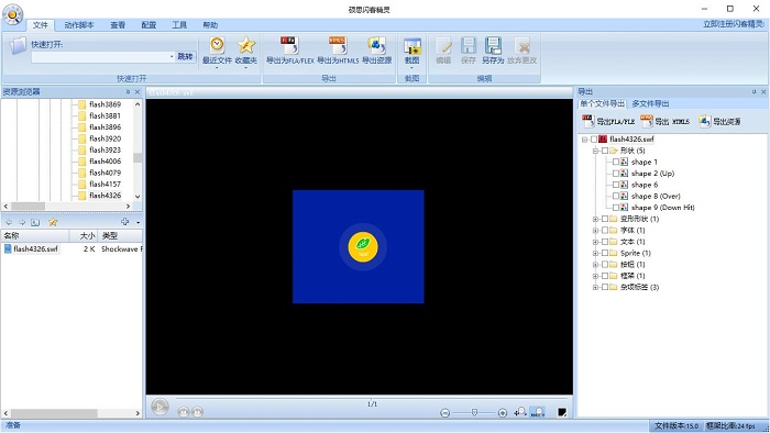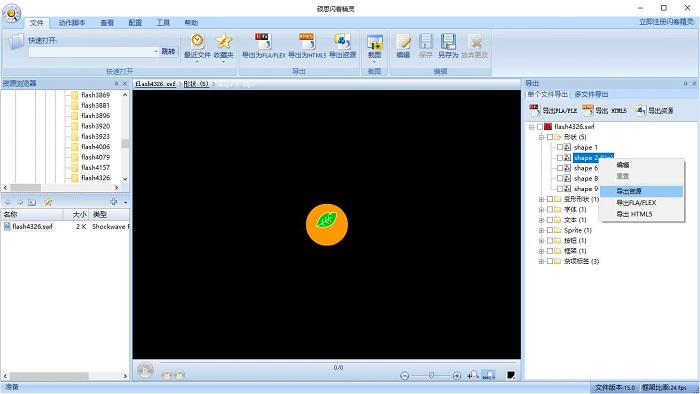首先,我们可以先使用闪客精灵视频格式转换软件的简单导出功能,将自己喜欢的图形直接导出。具体的操作是,先将动画导入到闪客精灵中,然后再从右侧的导出面板选中需导出的图形,最后在右键快捷菜单中选择“导出资源”即可。