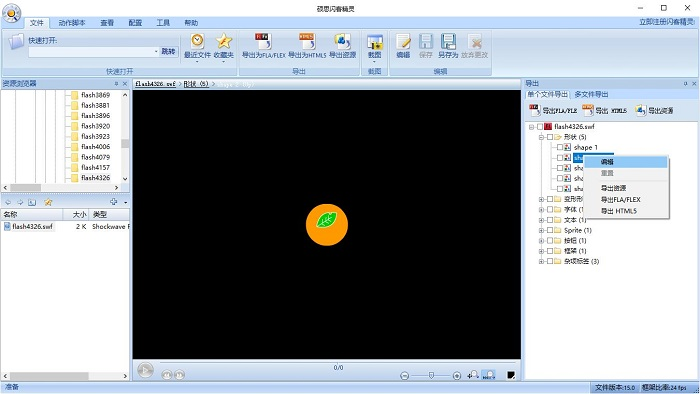 除了将图形导出外,我们还可以在闪客精灵视频格式转换软件中编辑该图形。具体的操作是,在右侧导出面板中右击选中需编辑的图形,然后在其右击菜单中选择“编辑”,即可进入图形的编辑面板。