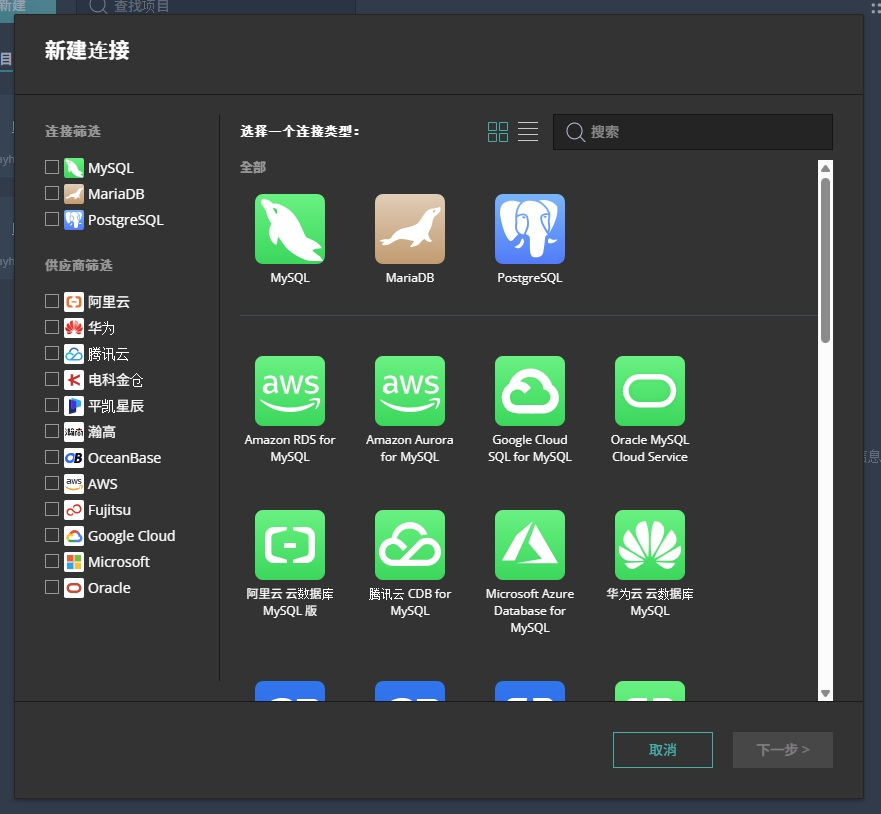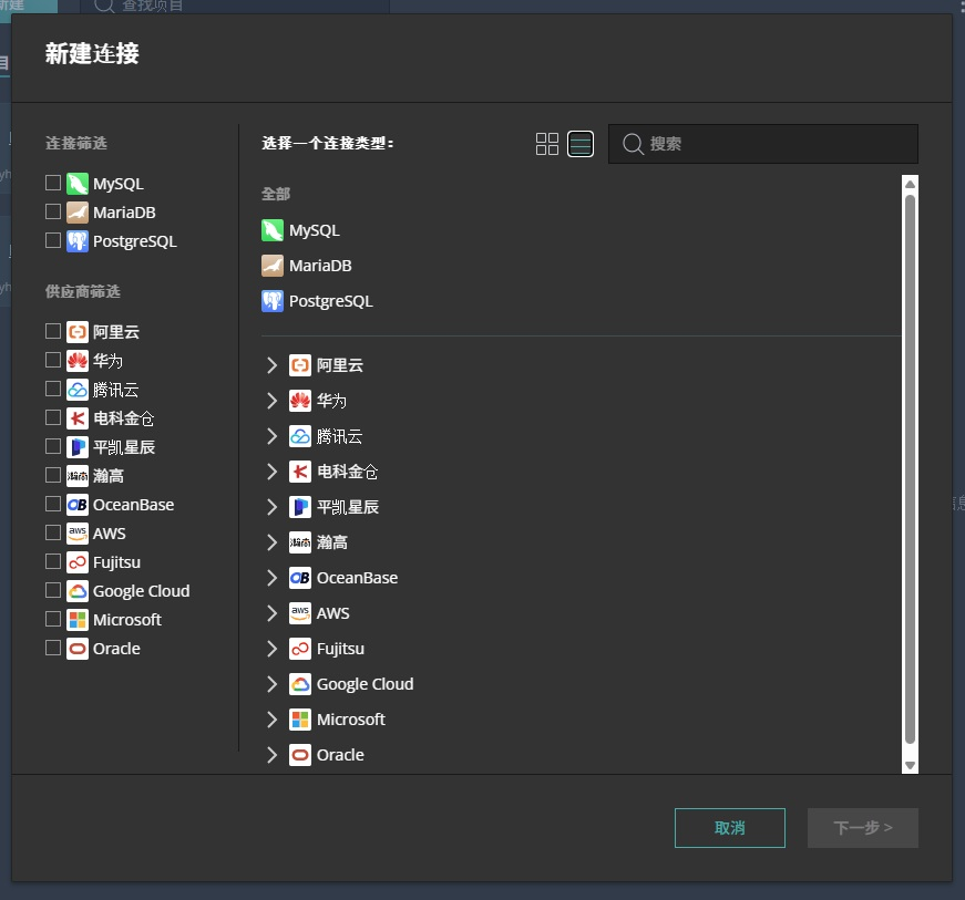 如果我们单击应用程序主屏幕顶部的“+新建”按钮,将出现一个包含两个项目的上下文菜单:“新建项目”和“新建连接”。单击后者将打开“新建连接”对话框。查看连接筛选,我们可以看到有许多新的连接类型,其中最引人注目的是 PostgreSQL。除此之外,供应商筛选还扩展到包括Fujitsu、HighGo、金仓等: