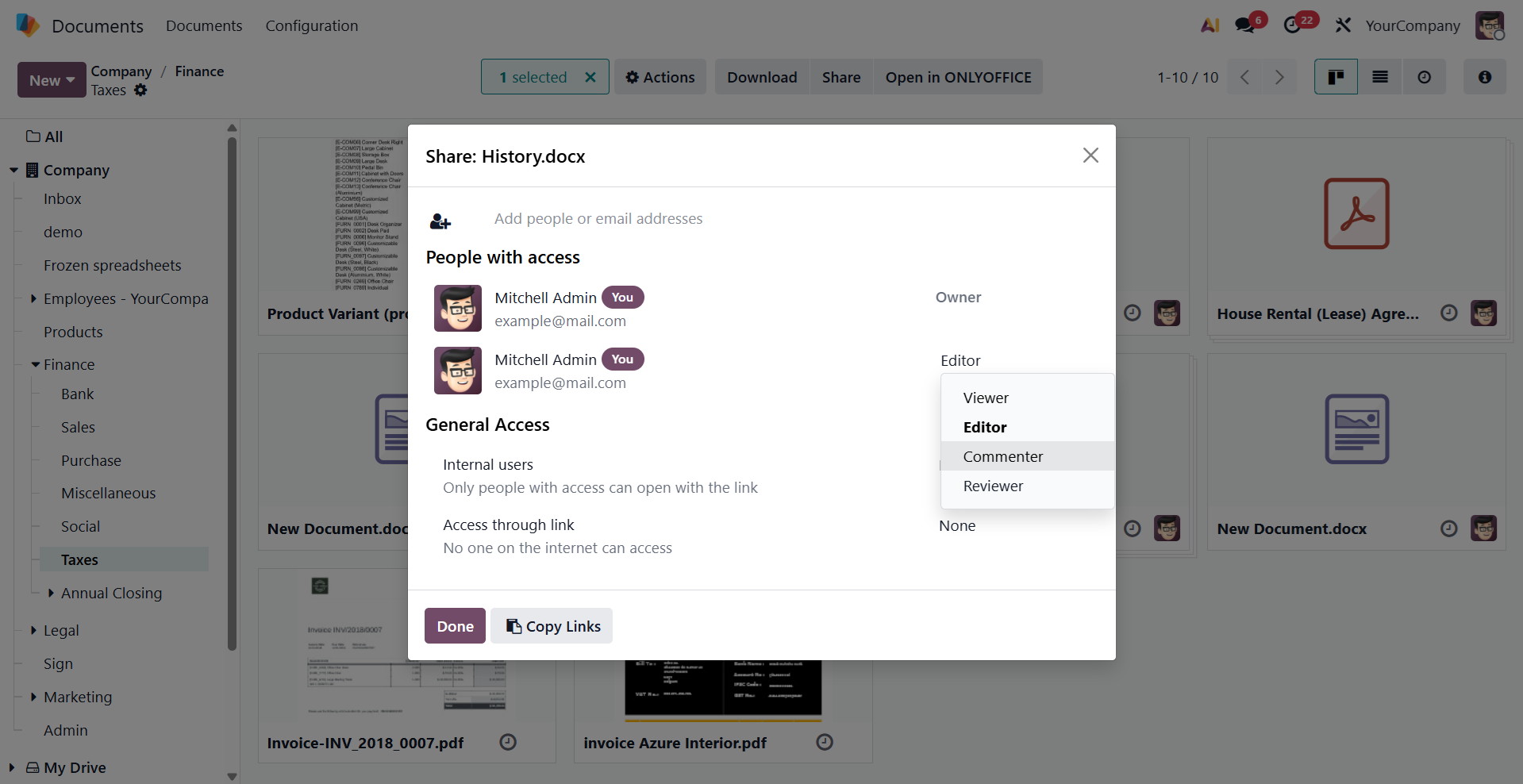 现在,用户可直接通过共享链接在 ONLYOFFICE 编辑器中打开文档进行查看。这大幅简化了与外部用户及合作伙伴的协作流程——无需授予对方 Odoo 系统的完整访问权限,即可共享文档访问权。