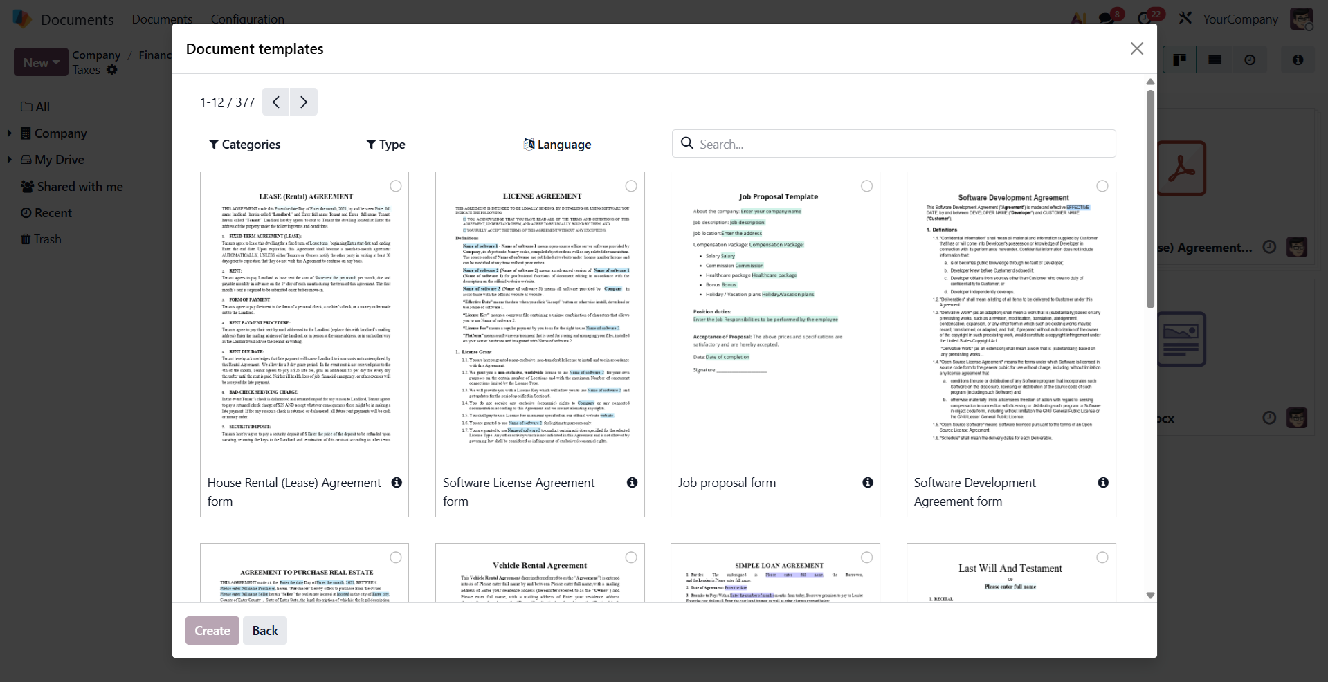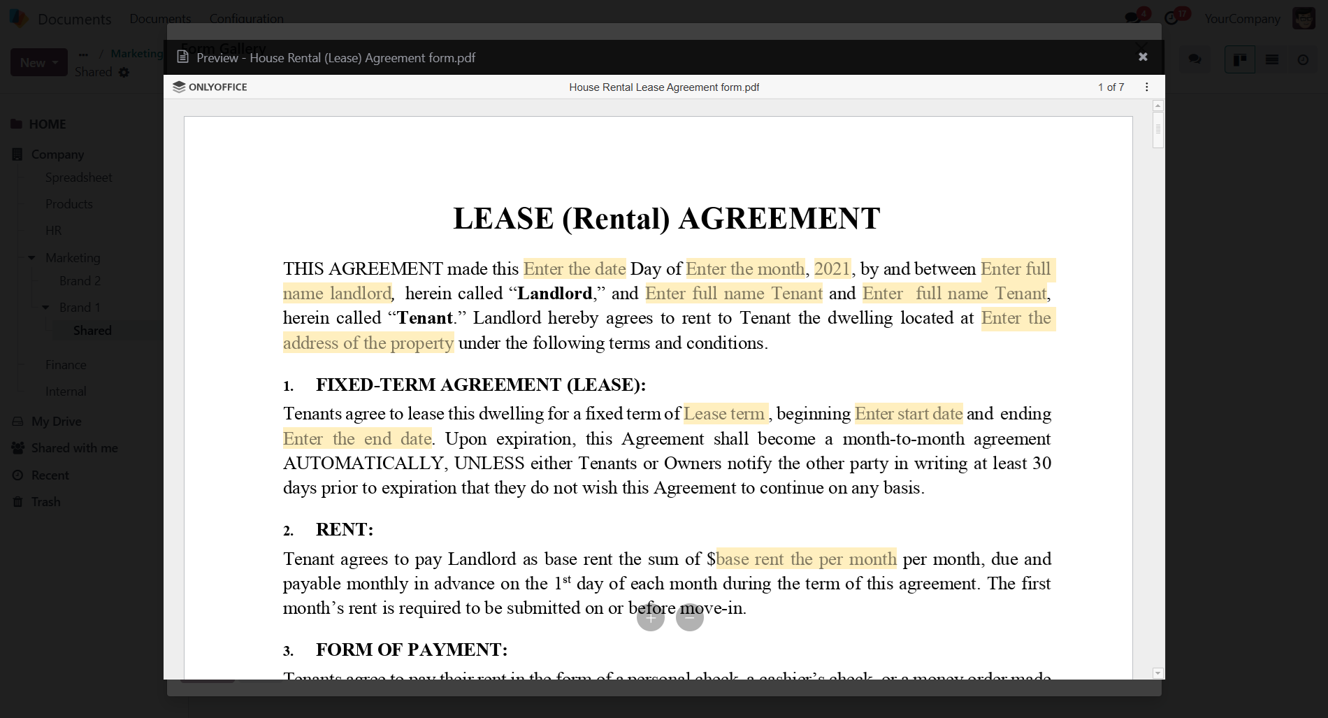 无需从头开始创建文档、电子表格或演示文稿,您可以从库中选择现有模板,然后在 ONLYOFFICE 编辑器中继续处理 — 编辑文本、调整布局并自定义文档以满足您的业务需求。