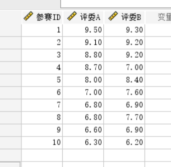 这里使用两个评委对10个运动员某项目评分,假两位评委对这十个运动员评分如下图所示。这里就用这两位评委对运动员评分进行一致性评价。