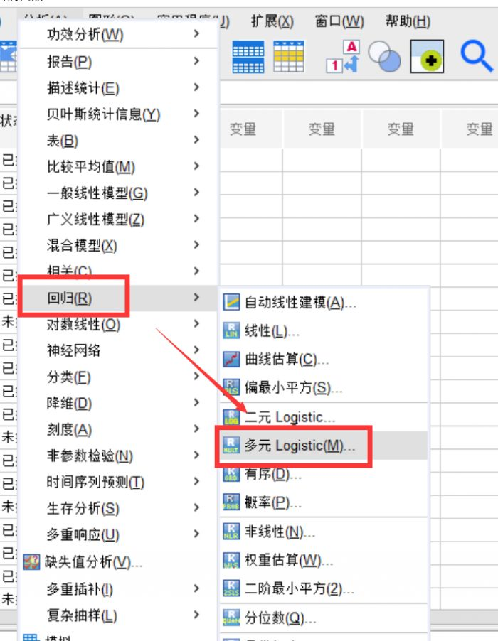 在“分析”菜单下,我们可以找到“回归”中的“多元logistic”分析,进入多元回归分析的窗口。