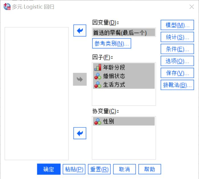 因子可以简单理解为自变量,我们这里将年龄分段、婚姻状况和生活方式作为因变量处理。