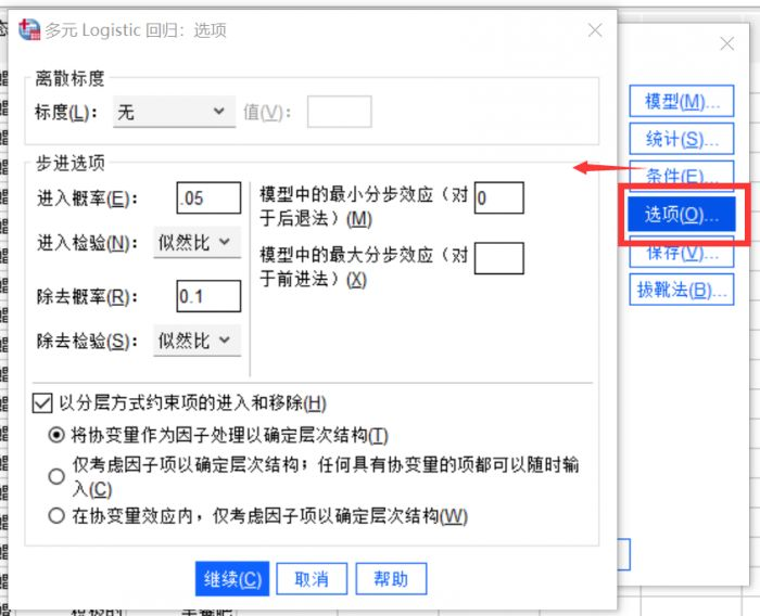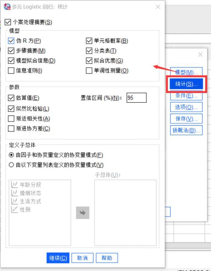 这个窗口内设置的是需要进行的统计数据分析,包括多类统计数据可选,我们勾选模型下的伪R方、单元格可能性、步骤摘要、分类表、模型拟合度信息和拟合度,参数下的估计(置信区间设置为95%)和似然比检验。