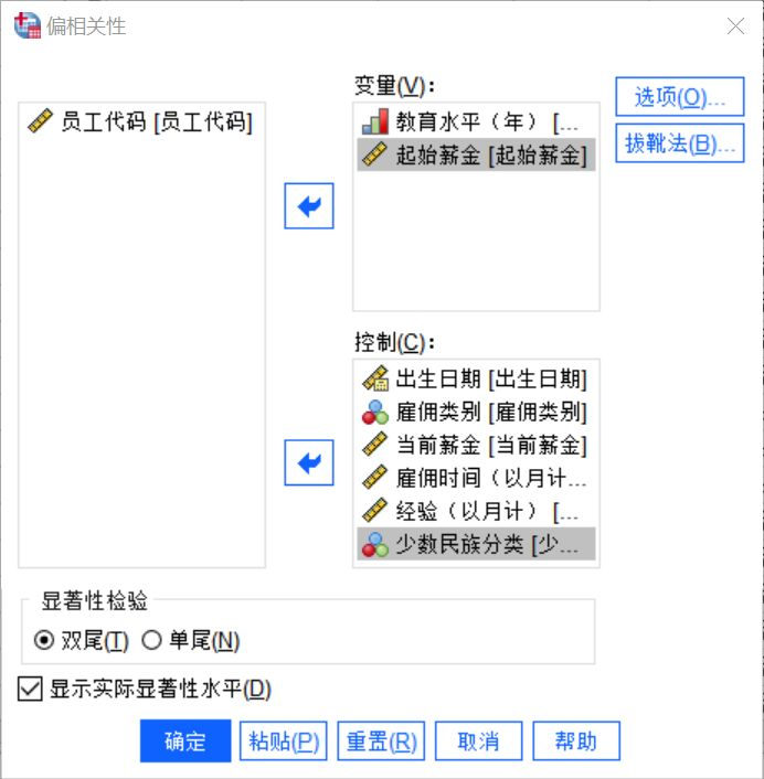 同样使用上述样本,如果我们要更为精确地探讨起始薪金和教育水平的相关性,可以将其余变量都视作干扰变量全部剔除,分析设置如上图。